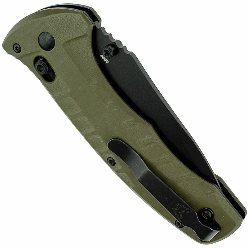 The 980SBK Benchmade Turret Knife is a formidable everyday carry that features a 3.70 inch part serrated drop point blade made of premium CPM S30V stainless steel, .124 inches thick, with a Rockwell hardness of 58-60. The blade has a non reflective black finish, a notched thumb ramp for secure grip, and dual thumb studs for ambidextrous one hand opening. The olive drab G10 handle, 4.90 inches closed, has milled texturing for secure grip, stainless steel liners and black anodized steel spacers for strength, sturdy AXIS Lock, a lanyard hole, and a side to side reversible steel pocket clip mounted at the butt end. The Benchmade Turret Knife has an overall open length of 8.60 inches, and it weighs 5.81 ounces. Proudly made in the USA.