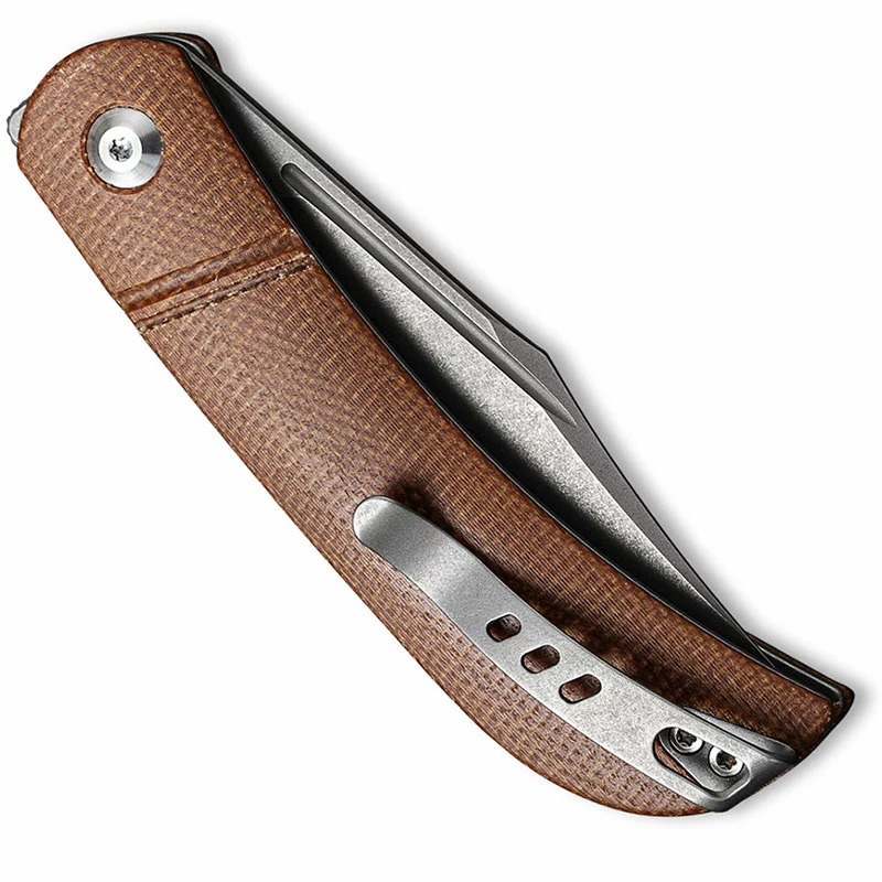 The C2015A CIVIVI Appalachian Drifter is a Double Detent Slip Joint gent style EDC, produced by CIVIVI (a subsidiary of WE Knife Company), that features a 2.96 inch non locking clip point blade made of CPM S35VN stainless steel, .10 inches thick, with a Rockwell hardness of 59-61, a hollow grind with fuller and tip swedge, non reflective gray stonewash finish and a flipper for ambidextrous one hand opening. The brown Micarta handle, 3.84 inches closed, has a caged ceramic ball bearing pivot for smooth, fast opening, gray stainless steel liners and Micarta backspacer for strength, and a removable deep carry stainless steel pocket clip mounted at the butt end. This WE CIVIVI Appalachian Drifter Knife has an overall open length of 6.8 inches, and it weighs 2.49 ounces. Made in China.