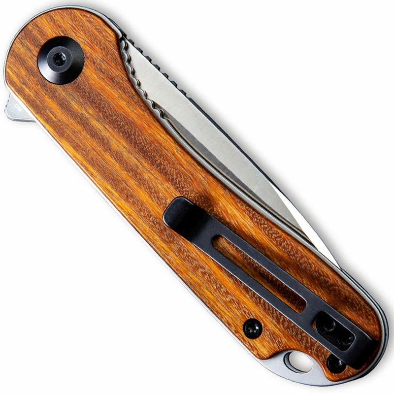 The C907C CIVIVI Elementum is a compact value price EDC produced by CIVIVI, a subsidiary of WE Knife Company, that features a 2.96 inch drop point blade made of D2 steel, .12 inches thick, with a Rockwell hardness of 59-61, a hollow grind, satin finish, notched thumb rest for secure grip and a flipper for ambidextrous one hand opening. The genuine rosewood handle, 4.03 inches closed, has a pivot with steel ball bearing support for smooth opening, gray stainless steel liners for strength, a sturdy liner lock, lanyard hole and a removable deep carry stainless steel pocket clip mounted at the butt end. This WE CIVIVI Elementum Knife has an overall open length of 6.99 inches, and it weighs 2.66 ounces. Made in China.