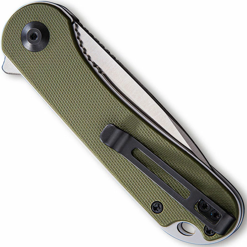 The C907E CIVIVI Elementum is a compact value price EDC produced by CIVIVI, a subsidiary of WE Knife Company, that features a 2.96 inch drop point blade made of D2 steel, .12 inches thick, with a Rockwell hardness of 59-61, a hollow grind, satin finish, notched thumb rest for secure grip and a flipper for ambidextrous one hand opening. The green G10 handle, 4.03 inches closed, has a pivot with steel ball bearing support for smooth opening, gray stainless steel liners for strength, a sturdy liner lock, lanyard hole and a removable deep carry stainless steel pocket clip mounted at the butt end. This WE CIVIVI Elementum Knife has an overall open length of 6.99 inches, and it weighs 2.89 ounces. Made in China.