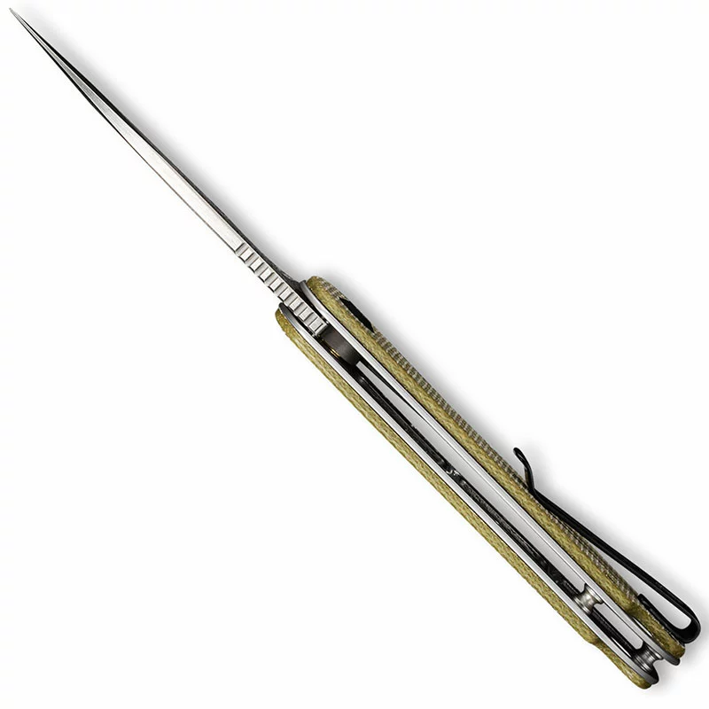 The C907S CIVIVI Elementum is a compact value price EDC produced by CIVIVI, a subsidiary of WE Knife Company, that features a 2.96 inch drop point blade made of D2 steel, .12 inches thick, with a Rockwell hardness of 59-61, a hollow grind, satin finish, notched thumb rest for secure grip and a flipper for ambidextrous one hand opening. The olive micarta handle, 4.03 inches closed, has a pivot with ceramic ball bearing support for smooth opening, gray stainless steel liners for strength, a sturdy liner lock, lanyard hole and a removable deep carry stainless steel pocket clip mounted at the butt end. This WE CIVIVI Elementum Knife has an overall open length of 6.99 inches, and it weighs 2.74 ounces. Made in China.