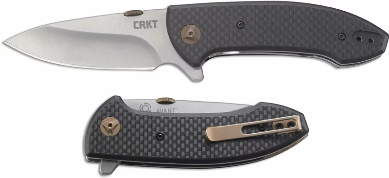 The CRKT 4620 Avant Knife is a compact classy everyday carry, designed by Oregon knifemaker Eric Ochs, that features a 3.175 inch drop point blade made of 8Cr14MoV stainless steel, .143 inches thick, with a satin finish, brass TiNi thumb disk accent, and a flipper for ambidextrous one hand opening. The sleek black woven carbon fiber handle, 4.312 inches closed, has contrasting brass TiNi pivot detailing, the IKBS Ball Bearing Pivot System for smooth, fast opening, steel liners for strength, a liner lock and a side to side reversible pocket clip mounted at the butt end. The Avant Knife has an overall open length of 7.50 inches, and it weighs 5.4 ounces.