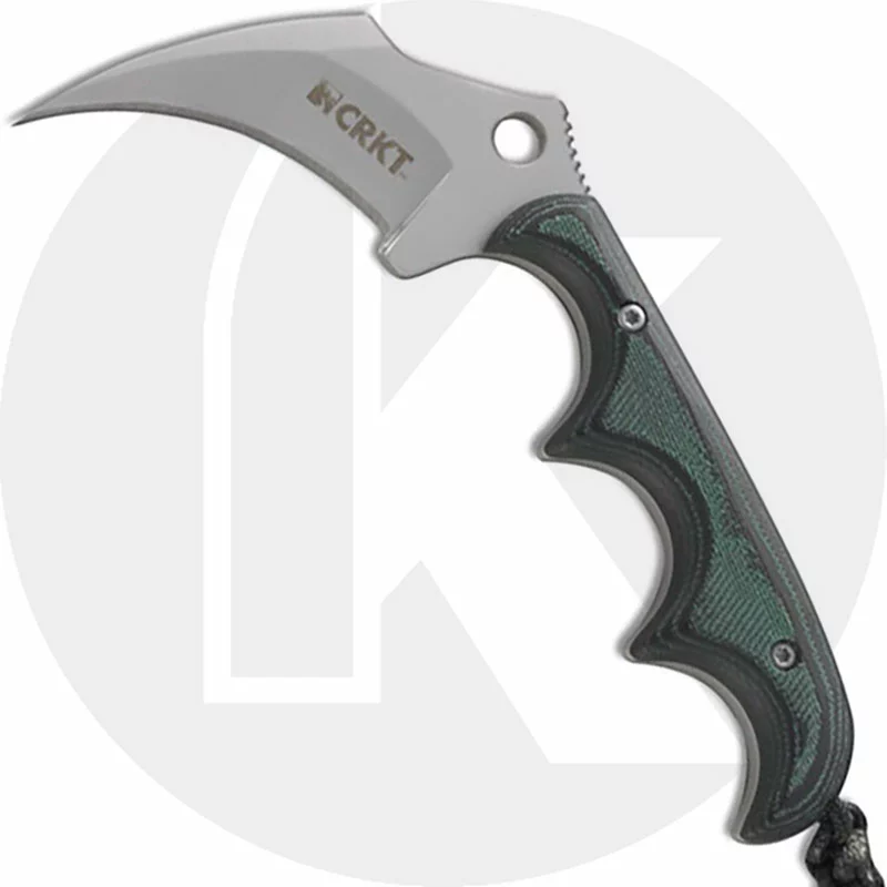 The illustrated CRKT Knife is the CRKT Keramin Knife, designed by Alan Folts, that features a 2.31″ karambit style fixed blade made of 5Cr15MoV stainless steel, .120″ thick, with a Rockwell hardness of 55-57. The blade of this CRKT knife has a hollow grind, a non reflective bead blast finish and a notched thumb ramp. The Keramin Knife has full tang construction for strength, finger grooves for secure grip, black and green two tone resin infused fiber scales, and a braided fob. A black polypropylene sheath with neck lanyard is included with this CRKT Knife. The CRKT Keramin Knife has an overall length of 4.78″, and it weighs 1.7 ounces; 2.2 ounces with the sheath.
