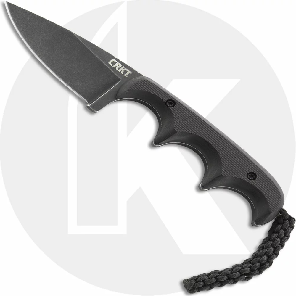 The illustrated CRKT Knife is the CRKT Minimalist Knife, designed by Alan Folts, that features a 2.16″ drop point fixed blade made of 5Cr15MoV stainless steel, .105″ thick, with a Rockwell hardness of 55-57. The blade of this CRKT knife has a non reflective black stonewash finish and a notched thumb rest. The Minimalist Knife has full tang construction for strength, finger grooves for secure grip, black G10 scales, and a braided fob. A black glass reinforced nylon sheath with neck lanyard is included with this CRKT Knife. The CRKT Minimalist Knife with black blade and black G10 handle has an overall length of 5.221″, and it weighs 2.3 ounces with the sheath.