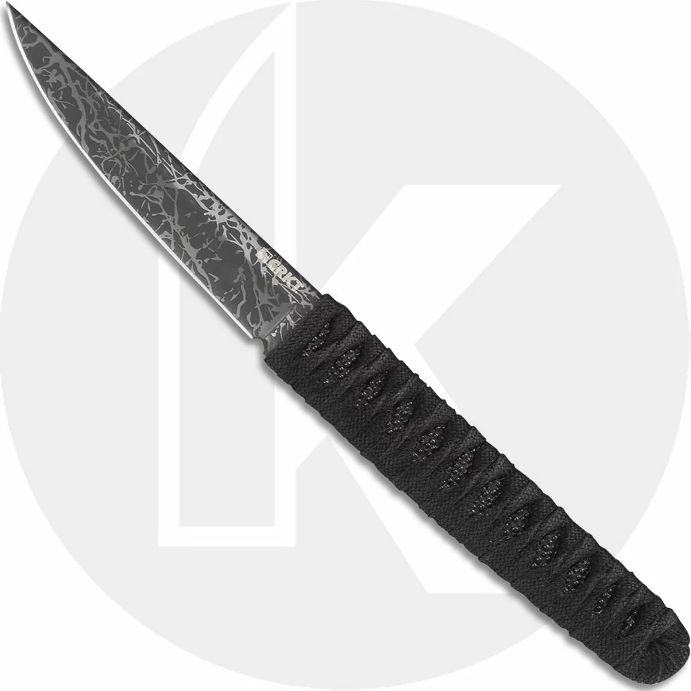 From the CRKT website: The Obakeâ„¢ by Lucas Burnley is bold. It’s a throwback to a classic Japanese Kwaiken design that’s ready to throw down, if trouble turns up. The distinctive blade of this full tang fixed blade knife has a gray titanium nitride finish that is acid etched to give it a unique pattern that will be exclusive to each fortunate owner. The handle has a katana style nylon cord wrap over a black faux ray skin.