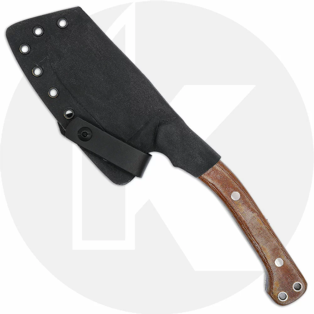 The 2014 CRKT Razel Nax, designed by Jon Graham of Cleveland, Tennessee, is a rugged, outdoor addition to the Razel Family that features a 4.29 inch chisel style axe head made of 1075 carbon steel, .20 inch thick, with a non reflective black stonewash finish. The Razel Nax has full tang construction for strength, brown resin infused fiber scales with chamfered edges for comfort and secure grip, and twin wrist / lanyard holes. A black Kydex sheath is included. The CRKT Razel Nax has an overall length of 11 inches, and it weighs 11.3 ounces, 13.5 ounces with the sheath.
