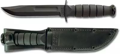 The illustrated KABAR knife is the Short Black KA-BAR Fighting Utility Knife that features a 5 1/4″ 1095 Cro-Van high carbon steel clip point blade with epoxy powder coat and blood groove. Oval Kraton G thermoplastic elastomer handle with powdered metal butt cap and carbon steel guard (butt cap and guard are powder coated). A leather sheath is included with this KABAR Knife. The Short Black KABAR Fighting Utility Knife has an overall length of 9 1/4″, and it weighs .40 pounds.
