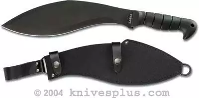 The illustrated KABAR machete is the KA-BAR Kukri Machete that features an 11 1/2″ 1085 carbon steel blade with epoxy powder coat. Contoured Kraton G thermoplastic elastomer handle with lanyard hole. A combination leather/Cordura sheath is included with this KABAR machete. The KABAR Kukri Machete has an overall length of 17″, and it weighs 1.7 pounds.