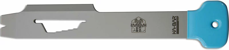 The 2484SF KA-BAR Bridge Breacher Tool features single piece gray powder coated 1095 Cro-Van steel construction, .25 inch thick, with a Rockwell hardness of 57-59, sturdy pry bar tip, 2 inch chisel ground blade area, wrench slots and a blue Plastisol grip. The KA-BAR Bridge Breacher Tool has an overall length of 13.0 inches, and it weighs 1 pound 9.6 ounces. Proudly made in the USA.