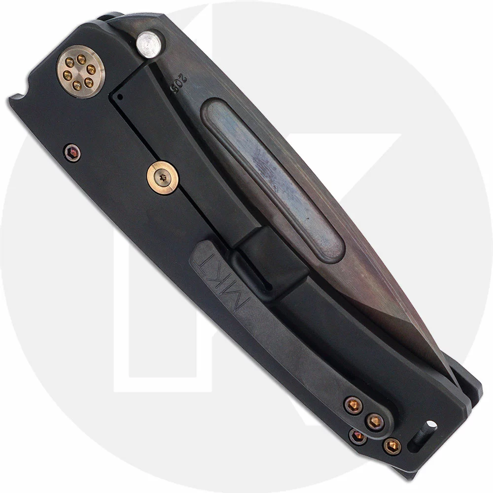From Medford: The Marauder-H with its clean lines and robust design follows the premise of less is more. Note the curved Fuller-groove that doubles to not only lighten the forward weight of the design but also as a sneaky thumb-slide groove for opening. The sides are .187 inch Titanium and The blade is .190 inch thick. This design gets its name from the A-26 Marauder of WW II repute. The Marauder was known for awesome fire-power and brute force toughness in battle.