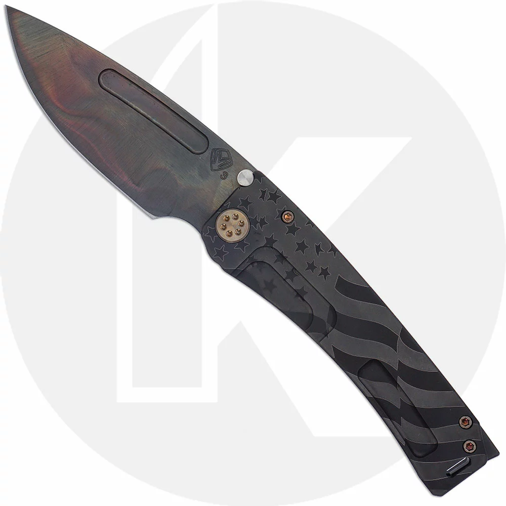 This Medford Marauder-H Knife is an eye catching EDC that features a 4.25 inch drop point blade made of CPM 3V steel, .190 inches thick, with Vulcan finish, dual stops that lock up against the frame for superior strength against sideways torque, and a deep fuller that lessens weight and also serves as a thumb groove for ambidextrous one hand opening. The PVD titanium handle, 5.0 inches closed, has gold American Flag engraved embellishment for visual interest, a sturdy frame lock, bronze hardware, PVD breaker and a PVD titanium pocket clip mounted at the butt end. The Medford Marauder-H Knife has an overall open length of 9.5 inches, and it weighs 8.8 ounces. Proudly made in the USA.
