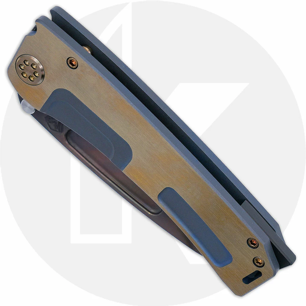 This Medford Marauder-H Knife is an eye catching EDC that features a 4.25 inch drop point blade made of S45VN stainless steel, .190 inches thick, with Vulcan finish, dual stops that lock up against the frame for superior strength against sideways torque, and a deep fuller that lessens weight and also serves as a thumb groove for ambidextrous one hand opening. The bead blast blue titanium handle, 5.0 inches closed, has faced bronze flats and milled grooves for visual interest, a sturdy frame lock, bronze hardware, Maker’s Breaker, and a bead blast blue with brushed bronze flats titanium pocket clip mounted at the butt end. The Medford Marauder-H Knife has an overall open length of 9.5 inches, and it weighs 8.8 ounces. Proudly made in the USA.