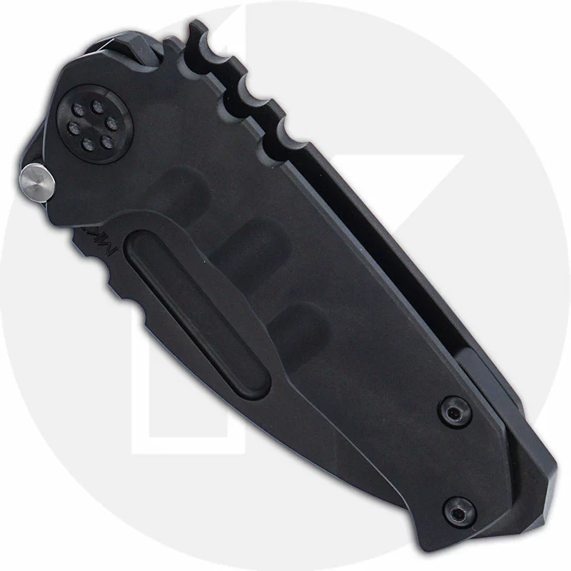 This Medford Micro Praetorian T Knife is a compact workhorse of an EDC that features a 2.8 inch tanto blade made of premium S35VN stainless steel, .190 inch thick, with non reflective PVD finish, dual stops that lock up against the frame for superior strength against sideways torque, and a deep fuller that lessens weight and also serves as a thumb groove for ambidextrous one hand opening. The PVD titanium handle, 4.0 inches closed, has milled grooves for visual interest, a sturdy frame lock, PVD hardware and breaker, and a PVD titanium pocket clip with brushed / flamed Galaxy flats mounted at the butt end. The Medford Micro Praetorian T Knife has an overall open length of 6.75 inches, and it weighs 4.9 ounces. Proudly made in the USA.