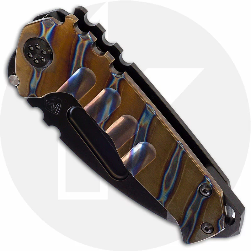 This Medford Praetorian Genesis T Knife is a bulldog of an EDC that features a 3.3 inch tanto blade made of premium S35VN stainless steel, .190 inch thick, with PVD finish, dual stops that lock up against the frame for superior strength against sideways torque, and a deep fuller that lessens weight and also serves as a thumb groove for ambidextrous one hand opening. The bronze anodized titanium handle, 4.35 inches closed, has an eyecatching Tiger Stripes embellishment and milled grooves for visual interest, a sturdy frame lock, massive backspacer with integral breaker, lanyard hole, and a titanium pocket clip mounted at the butt end. The Medford Praetorian Genesis T Knife has an overall open length of 7.5 inches, and it weighs 7.3 ounces. Proudly made in the USA.