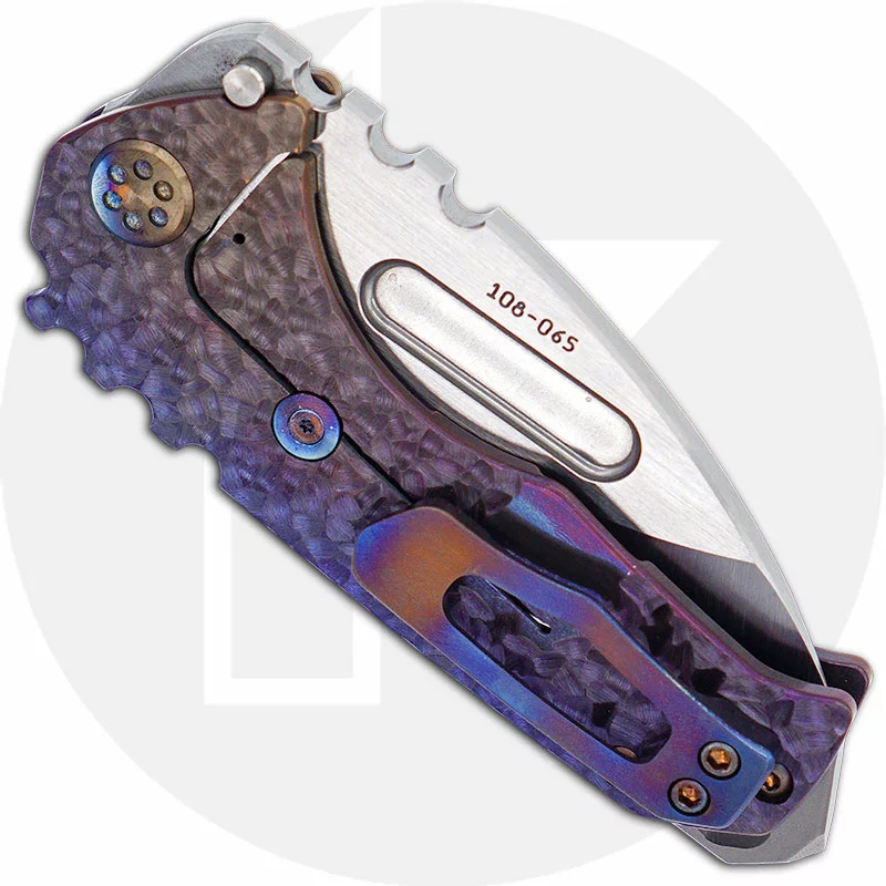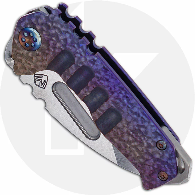 This Medford Praetorian Genesis T Knife is a bulldog of an EDC that features a 3.3 inch drop point blade made of premium S35VN stainless steel, .190 inch thick, with satin finish, dual stops that lock up against the frame for superior strength against sideways torque, and a deep fuller that lessens weight and also serves as a thumb groove for ambidextrous one hand opening. The bronze / violet titanium handle, 4.35 inches closed, has an eyecatching Hammered Fade sculpted finish and milled grooves, a sturdy frame lock, massive backspacer with NP3 breaker, flamed hardware and flamed titanium pocket clip mounted at the butt end. The Medford Praetorian Genesis T Knife has an overall open length of 7.5 inches, and it weighs 7.3 ounces. Proudly made in the USA.