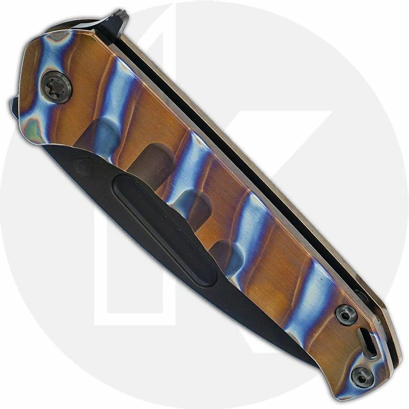 This Medford Praetorian Slim Flipper Knife is a sleek little everyday carry that features a 3.25 inch drop point blade made of premium S35VN stainless steel with PVD finish, a deep fuller that lessens weight, and a flipper for ambidextrous one hand opening. The slim profile titanium handle, 4.35 inches closed, has faced / flamed Bronze Stripes front and bronze back, ball bearing pivot support for smooth action, milled grooves for visual interest, sturdy frame lock, PVD hardware, lanyard hole and a PVD titanium pocket clip mounted at the butt end. The Medford Praetorian Slim Flipper Knife has an overall open length of 7.6 inches, and it weighs 4.0 ounces. Proudly made in the USA.