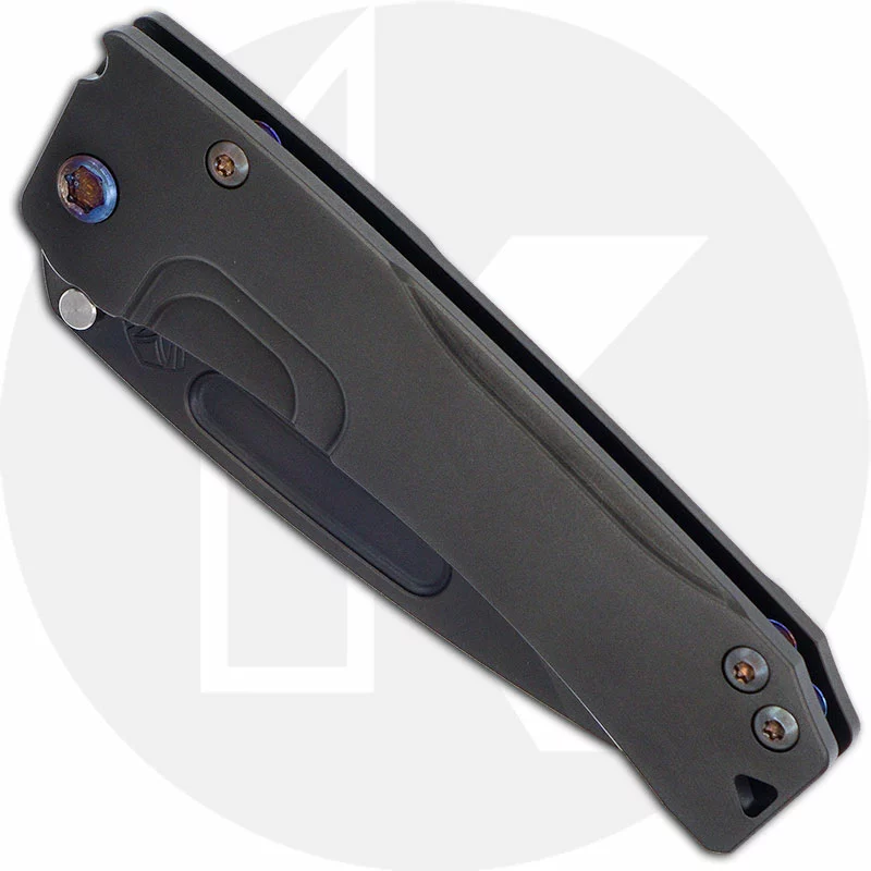 This Medford Slim Midi Knife is a gent’s style everyday carry that features a 3.25 inch drop point blade made of premium S35VN stainless steel, .125 inch thick, with PVD finish, dual stops that lock up against the frame for superior strength against sideways torque, and a deep fuller that lessens weight and also serves as a thumb groove for ambidextrous one hand opening. The slim profile PVD titanium handle, 4.38 inches closed, has milled grooves for visual interest, a sturdy frame lock, flamed hardware, and brushed / flamed titanium pocket clip mounted at the butt end. The Medford Slim Midi Knife has an overall open length of 7.9 inches, and it weighs 4.1 ounces. Proudly made in the USA.
