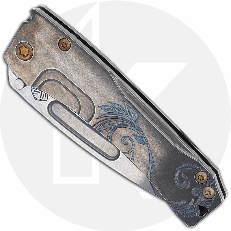 This Medford Slim Midi Knife is a gent’s style everyday carry that features a 3.25 inch drop point blade made of premium S35VN stainless steel, .125 inch thick, with tumbled finish, dual stops that lock up against the frame for superior strength against sideways torque, and a deep fuller that lessens weight and also serves as a thumb groove for ambidextrous one hand opening. The slim profile tumbled titanium handle, 4.38 inches closed, has Filigree engraved embellishment and milled grooves for visual interest, a sturdy frame lock, bronze hardware, and a bronze titanium pocket clip mounted at the butt end. The Medford Slim Midi Knife has an overall open length of 7.9 inches, and it weighs 4.1 ounces. Proudly made in the USA.