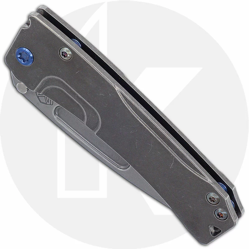 This Medford Slim Midi Knife is a gent’s style everyday carry that features a 3.25 inch tanto blade made of premium S35VN stainless steel, .125 inch thick, with tumbled finish, dual stops that lock up against the frame for superior strength against sideways torque, and a deep fuller that lessens weight and also serves as a thumb groove for ambidextrous one hand opening. The slim profile tumbled titanium handle, 4.38 inches closed, has milled grooves for visual interest, a sturdy frame lock, blue hardware, and a brushed blue titanium pocket clip mounted at the butt end. The Medford Slim Midi Knife has an overall open length of 7.9 inches, and it weighs 4.1 ounces. Proudly made in the USA.