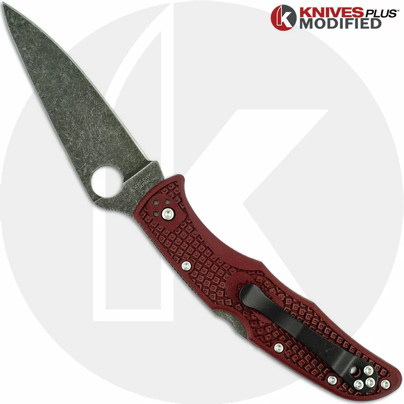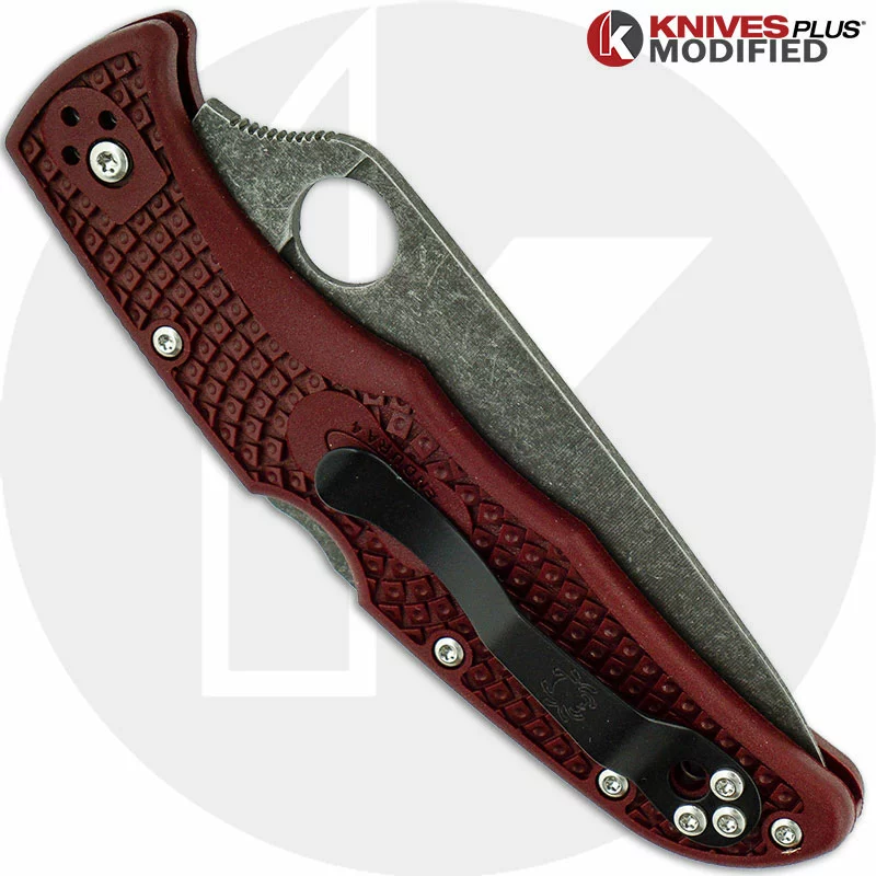 The illustrated Spyderco Knife is the MODIFIED Spyderco Endura4 Lightweight Knife that features an ACID STONEWASHED 3.8″ blade made of VG10 stainless steel. The blade of this MODIFIED Spyderco knife has a full flat grind WITH AN ACID WASH, a notched thumb ramp and an enlarged hole for ambidextrous one hand opening. The RIT DYED BURGUNDY fiberglass reinforced nylon handle, 4.98″ closed, has Bi-Directional texturing for maximum grip, skeletonized steel liners, a Boye dent lockback, and a lanyard hole. A side to side and end to end reversible black steel pocket clip is included with this Spyderco knife. The MODIFIED Spyderco Endura4 Lightweight Knife with flat ground blade and RIT DYED BURGUNDY handle has an overall open length of 8.78″, and it weighs 3.4 ounces. Made in Japan.