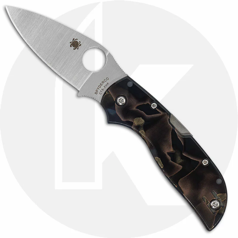 The illustrated Spyderco Knife is the Spyderco Chaparral Knife, that features a 2.80″ blade made of CTS XHP stainless steel, .079″ thick. The blade of this Spyderco knife has a flat grind, a notched choil and thumb rest for secure grip, and the Spyderco hole for ambidextrous one hand opening. The Raffir Noble handle (smoke colored acrylic with brass and copper wire mesh), 3.60″ closed, has a lockback. A side to side reversible wire clip is mounted at the butt end of this Spyderco Knife. The Spyderco Chaparral Knife with Raffir Noble handle has an overall open length of 6.40″, and it weighs 2.3 ounces. Made in Taiwan.