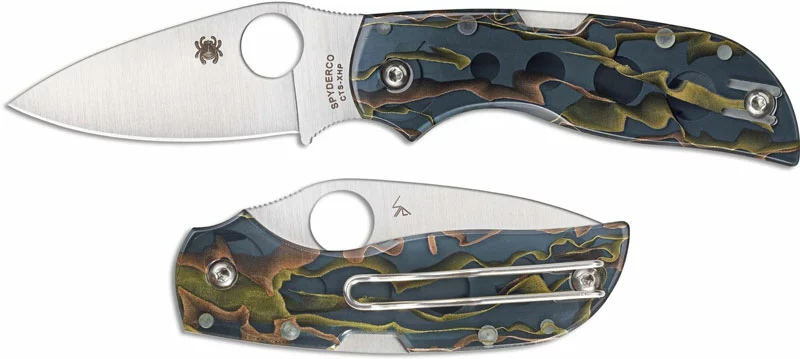 From the Spyderco website: The new Chaparral Raffir Noble features stainless steel liners and smoke-colored Raffir Noble scales. Manufactured in Denmark, Raffir is a strikingly beautiful composite material that encapsulates metal mesh in a translucent epoxy resin. Raffir Noble combines a smoke-colored acrylic with brass and copper wire mesh to yield a unique, semi-transparent, three dimensional pattern. All other details of this knife are consistent with the Chaparral family, including a full-flatground CTS XHP blade, a sturdy back lock mechanism, and a reversible deep-pocket wire clip positioned for tip-up carry.