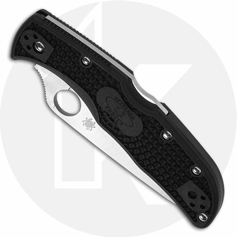 The C243PBK Spyderco Endela Knife is an EDC that perfectly bridges the gap between the classic Delica 4 and the Endura 4 Lightweight Models. This Endela features a 3.41 inch drop point blade made of VG-10 stainless steel, .118 inch thick, with a full flat grind, a notched choil and thumb ramp for secure grip, and the Spyderco hole for ambidextrous one hand opening. The black FRN (fiberglass reinforced nylon) handle, 4.69 inches closed, has Bi-Directional Texturing for secure purchase, skeletonized stainless steel liners, sturdy lockback, lanyard hole, and a side to side and end to end reversible pocket clip. The Spyderco Endela Knife has an overall open length of 8.10 inches and it weighs 3.1 ounces. Made in Japan.