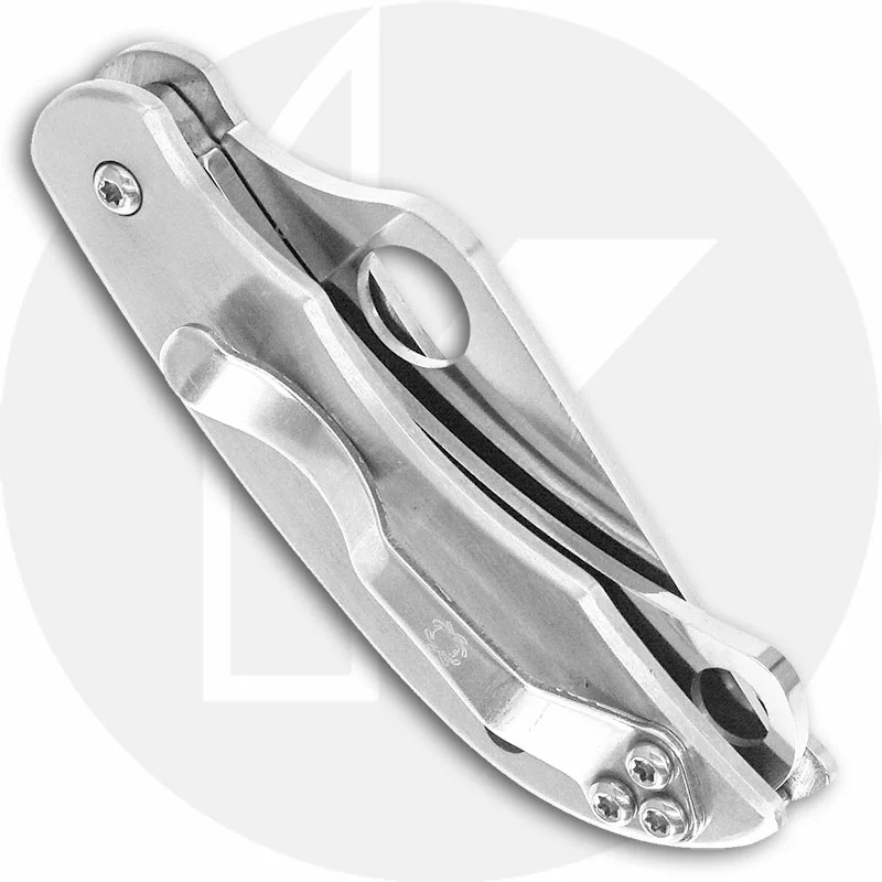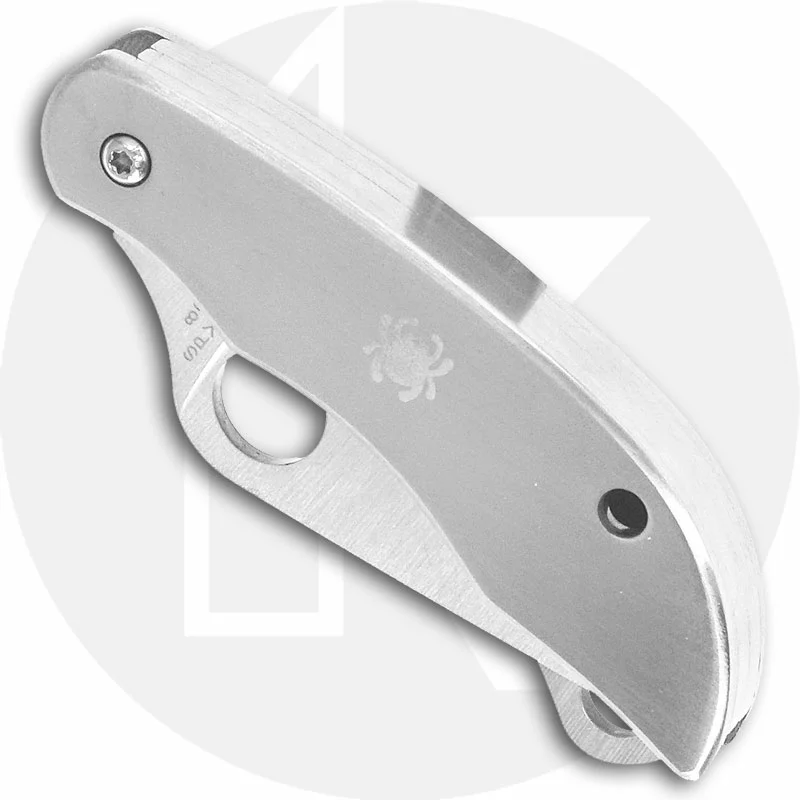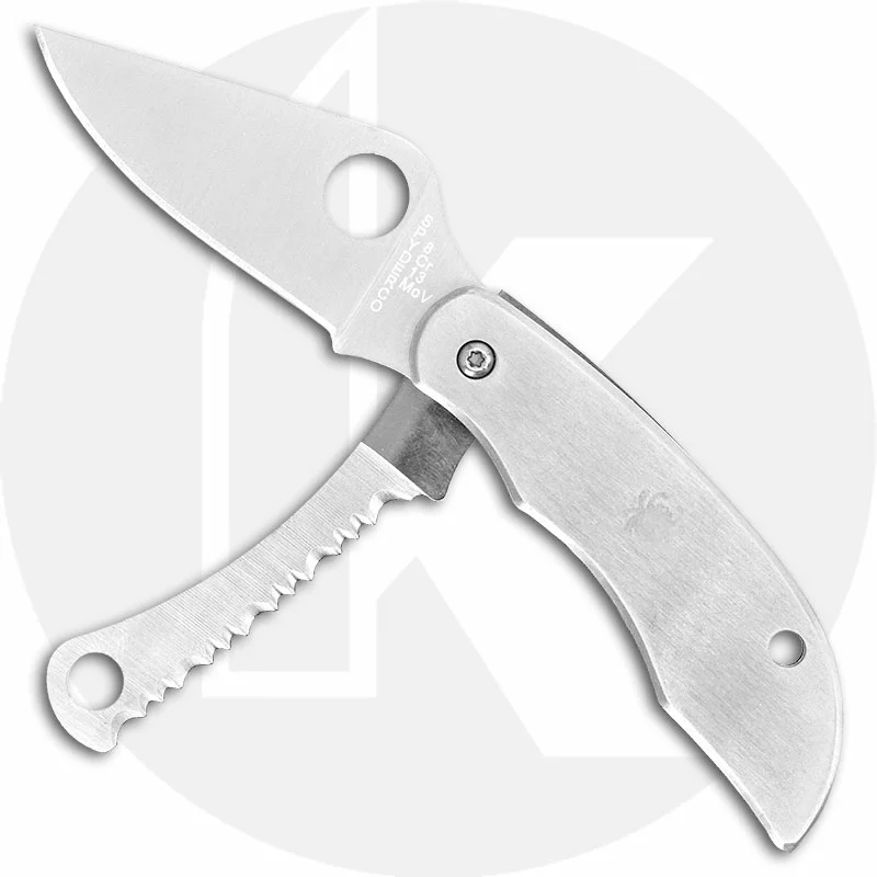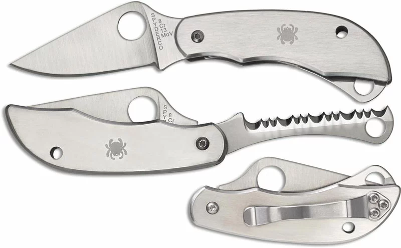 The illustrated Spyderco Tool is the Spyderco ClipiTool with Serrated Blade that features a 2″ non locking drop point blade made of 8Cr13MoV stainless steel, .079″ thick, and a serrated sheepfoot blade. The drop point blade of this Spyderco knife has a flat grind, and both blades have a hole for easy opening. The contoured stainless steel handle, 2.57″ closed, has bug detailing and a lanyard hole. A removable steel pocket clip is mounted at the butt end of this Spyderco Tool. The Spyderco ClipiTool with Serrated Blade has an overall open length of 4.57″ and it weighs 1.8 ounces. Made in China.