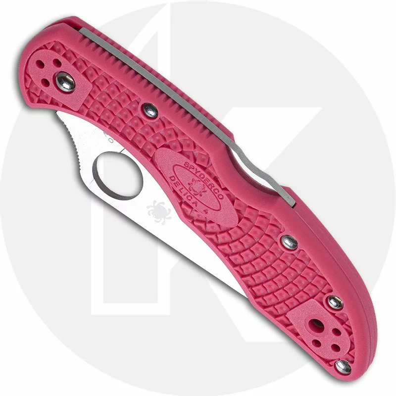 From the Spyderco Reveal website:Since its introduction 30 years ago, the Delica has been the platform for dozens of different combinations of blade steels, handle colors, and handle materials. This remarkable rendition of the Delica 4 Lightweight combines a full-flat-ground blade crafted from American-made CPM S30V stainless steel with a brilliant pink handle. The injection-molded handle includes Spyderco’s signature Bi-Directional Texture pattern for a non-slip grip and a black four-position pocket clip configurable for all carry positions.