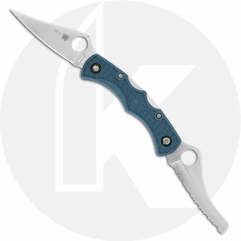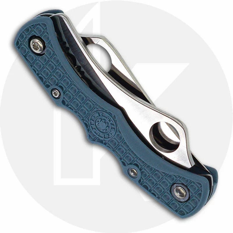 The C39P&SBG Spyderco Dyad Jr Knife 2011 Sprint Run features 2 7/16 inch clip point and serrated sheepfoot blades made of VG-10 stainless steel with hole for ambidextrous one hand opening. The textured blue gray FRN (Fiberglass Reinforced Nylon) handle, 3 7/32 inches closed, has a double lockback. The C39P&SBG Dyad Jr is serial numbered; made in Japan in 2011. Discontinued item, BNIB.