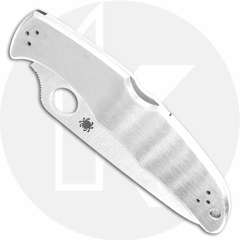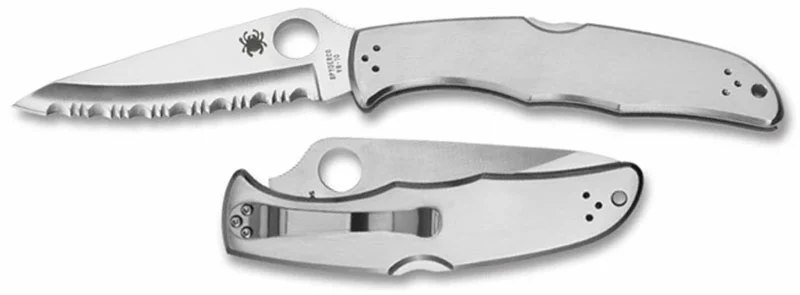 The illustrated Spyderco Knife is the Spyderco Endura 4 SS Knife that features a 3.85″ serrated blade made of VG10 stainless steel. The blade of this Spyderco knife has a notched thumb ramp and a Spyderco hole for ambidextrous one hand opening. The stainless steel handle, 4.92″ closed, has a Boye dent lockback and lanyard hole. A side to side and end to end reversible metal pocket clip is included with this Spyderco knife. The Spyderco Endura 4 SS Knife has an overall length of 8.77″ and weighs 5.6 ounces.