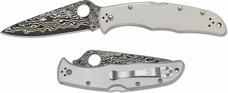 From the Spyderco manufacturer’s catalog: This elite version of the Endura has a flat-ground blade with a VG-10 stainless steel core flanked on each side by 15-layer Damascus. It is paired with a high-tech titanium handle and four-position hourglass clip.