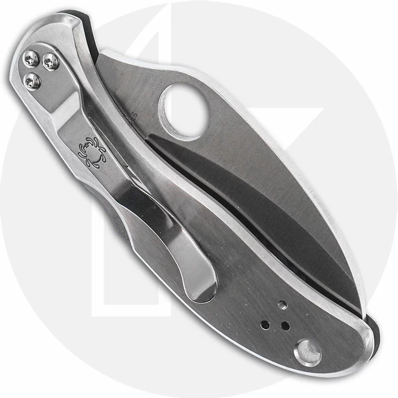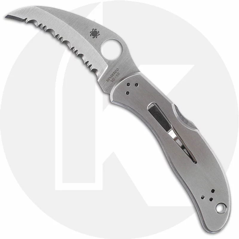 The illustrated Spyderco Knife is the Spyderco Harpy Knife that features a 2.75″ serrated hawkbill blade made of VG10 stainless steel. The blade of this Spyderco knife has the Spyderco hole for ambidextrous one hand opening. The stainless steel handle, 3.88″ closed, has a drying vent that also functions as a shackle key, a Boye Dent lockback and a lanyard hole. A side to side and end to end reversible steel pocket clip is included with this Spyderco Knife. The Spyderco Harpy Knife has an overall open length of 6.63″, and it weighs 3.9 ounces. Made in Japan.