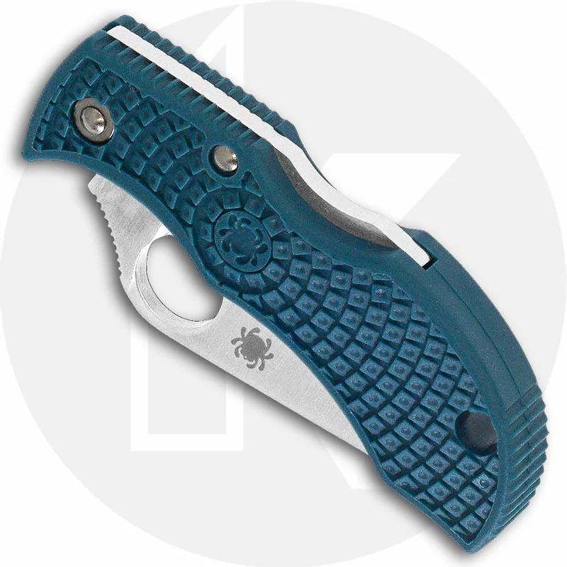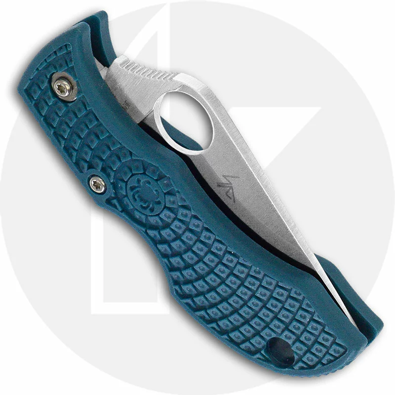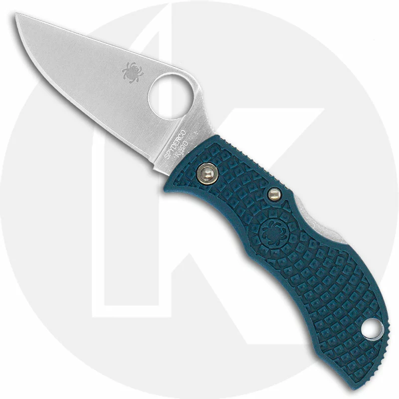 The MFPK390 Spyderco Manbug Lightweight K390 Knife is a new iteration of a classic keyring / pocket knife that features a 1.97 inch drop point blade made of Bohler-Uddeholm K390 tool steel, .098 inch thick. The blade has a full flat grind, a notched thumb ramp for secure grip, and the Spyderco Hole for ambidextrous one hand opening. The blue FRN (fiberglass nylon resin) handle, 2.50 inches closed, has ergonomic contours and Bi-Directional Texturing for secure purchase, a sturdy lockback and a keyring / lanyard hole. The Spyderco Manbug Lightweight K390 Knife has an overall open length of 4.47 inches, and it weighs .7 ounce. Made in Japan.