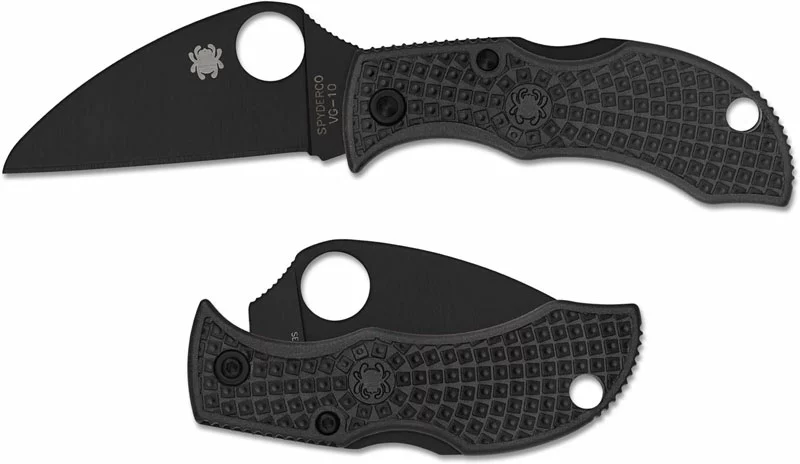 The MBKWPBK Spyderco Manbug Lightweight Knife is a trendy iteration of a classic keyring / pocket knife that features a 1.97 inch Wharncliffe blade made of VG-10 stainless steel, .098 inch thick, with a non reflective black titanium carbonitride finish. The blade has a full flat grind, a notched thumb ramp for secure grip, and the Spyderco Hole for ambidextrous one hand opening. The black FRN (fiberglass nylon resin) handle, 2.50 inches closed, has ergonomic contours and Bi-Directional Texturing for secure purchase, a sturdy lockback and a keyring / lanyard hole. The Spyderco Manbug Lightweight Knife has an overall open length of 4.47 inches, and it weighs .7 ounce. Made in Japan.