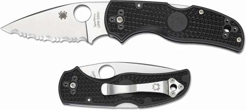 The illustrated Spyderco Knife is the Spyderco Native 5 FRN Knife that features a 2.95″ serrated spear point blade made of CPM S30V stainless steel, .125″ thick. The blade of this Spyderco knife has a matte finish, a flat grind, a subtle top swedge, a notched thumb rest for secure grip, and the Spyderco hole for ambidextrous one hand opening. The contoured black FRN (fiberglass reinforced nylon) handle, 4.00″ closed, has Bi-Directional Texturing, a lockback and a large lanyard hole. A four position steel pocket clip is included with this Spyderco Knife. The Spyderco Native 5 FRN Knife has an overall open length of 6.95″ and it weighs 2.5 ounces. Made in the USA.