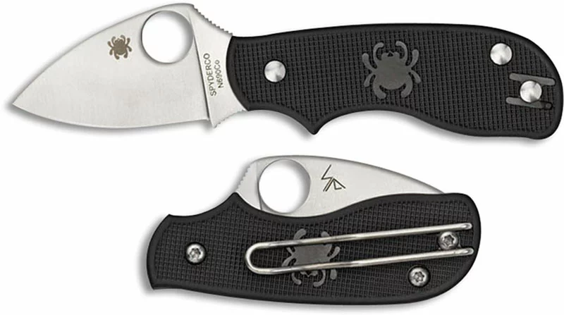 The C154PBK Spyderco Squeak Knife features a 2 inch non locking leaf shaped blade made of N690Co stainless steel with flat grind, a notched thumb ramp and choil for secure grip, and the Spyderco hole for ambidextrous one hand opening. The contoured black FRN (fiberglass reinforced nylon) handle, 3.125 inches closed, has texturing for secure grip and bug detailing. A side to side reversible wire clip is mounted at the butt end of this Spyderco Knife. The Spyderco Squeak Knife has an overall open length of 5.03 inches, and it weighs 1.6 ounces. Made in Italy circa 2011. Discontinued item, serial numbered, BNIB