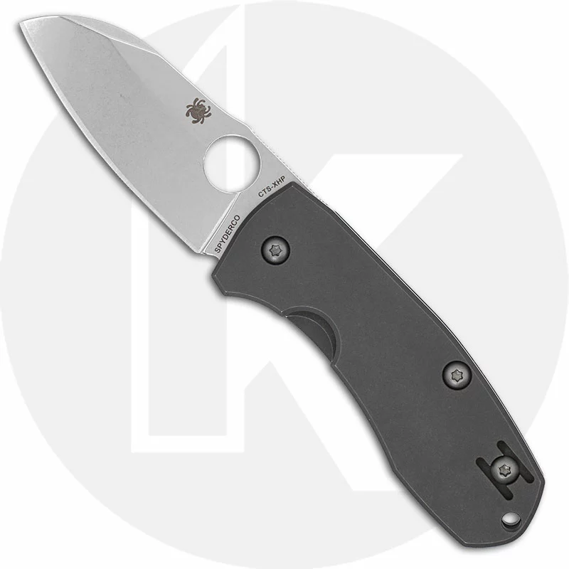 The C158TIP2 Spyderco Techno 2 knife is a slimmer version of the original Techno compact powerhouse, designed by Polish custom knifemaker Marcin Slysz, that features a 2.55 inch beefy sheepfoot blade made of CTS XHP stainless steel, .138 inches thick, with a high saber grind, a swedged tip, notched thumb rest for secure grip, and the Spyderco Trademark Round Hole for ambidextrous one hand opening. The matte titanium handle, 3.44 inches closed, has the sturdy R.I.L. Reeve Integral Lock, color anodized standoffs, a lanyard hole, and a side to side reversible wire clip mounted at the butt end. The Spyderco Techno 2 Knife has an overall open length of 5.99 inches, and it weighs 3.4 ounces. Made in Taiwan.