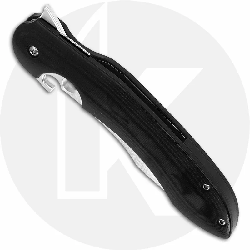 The C237GP Spyderco Tropen knife is a striking everyday carry, designed by Argentinean custom knifemaker Javier Vogt, that features a 4.02 inch dramatic curved blade made of CPM S30V stainless steel, .138 inches thick, with a full flat grind, a deep belly, a flipper, Spyderco Trademark Round Hole, and the Emerson Opener for ambidextrous one hand opening (an for open upon withdrawal). The polished black G10 handle, 5.11 inches closed, has Ball Bearing Washers for smooth opening, rounded ergonomic contours for secure grip, sturdy Compression Lock, and a removable stainless steel pocket clip mounted at the butt end. The Spyderco Tropen Knife has an overall open length of 9.13 inches, and it weighs 4.1 ounces. Made in Taiwan.