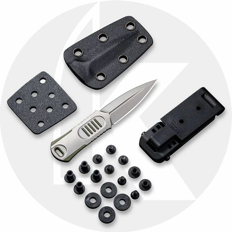 The 2017A WE Knife Company OSS Dagger is a compact EDC backup, designed by Justin Lundquist, that features a 2.22 inch double edge dagger blade made of premium CPM 20CV stainless steel, .13 inches thick, with a Rockwell hardness of 59-61, chisel grind with fuller and a stonewash finish. The slim stonewash stainless steel handle has textured green G10 front and back inlays, notches for secure grip, and a large lanyard hole. A black Kydex sheath with ball chain and MOLLE Lok is included. The WE OSS Dagger Knife has an overall length of 4.30 inches, and it weighs .72 ounces. Made in China. Sorry, no CA / MA sales.