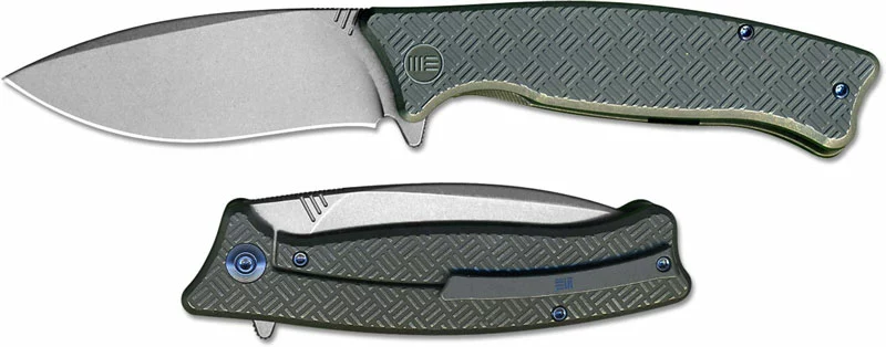 This We Balaenoptera Knife – an eye catching EDC folder, features a 3.55″ modified drop point blade made of Bohler M390 stainless steel, .16″ thick, with a Rockwell hardness of 59-61. The blade has a slight recurve, a flat grind, a swedged tip, a stonewash finish, a notched thumb rest for secure grip, and a flipper for ambidextrous one hand opening. The gray 6AL4V titanium handle, 5.05″ closed, has milled WE logo detailing for secure purchase and visual interest, a pivot with ceramic ball bearing support for smooth opening, a titanium frame lock with steel lock bar over travel preventer, a titanium back spacer for strength, a discreet titanium lanyard post, and a removable titanium pocket clip mounted at the butt end. The We Balaenoptera has an overall open length of 8.6″, and it weighs 4.9 ounces. Made in China.